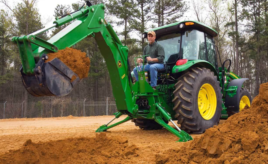 The front of the 595 Backhoe subframe is attached to the tractor with quick-pins for fast installation and removal. The backhoe’s hydraulic hoses attach to the tractor hydraulic system (requires the power-beyond kit) with quick-couplers, further enhancing the ease of hookup and removal.